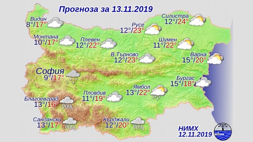 Ночью с запада облачность продолжит увеличиваться. В юго-западных районах пройдут дожди. Минимальная температура будет между 8° и 13°. Днем будет облачно, в Юго-западной Болгарии с осадками. Максимальная температура будет между 16° и 21°, в Северо-восточной Болгарии – около 23°... Прогноз погоды в Болгарии на 13 ноября