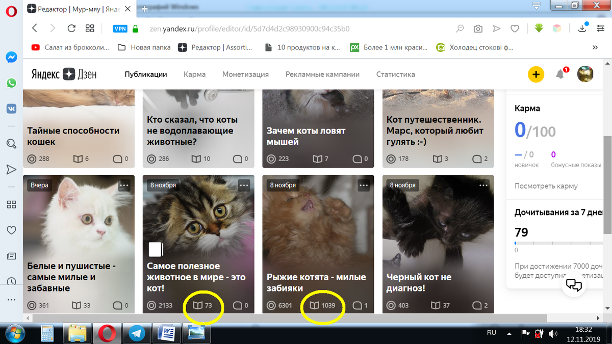 У меня сейчас монетизация, и дочитываний не видно, но вот недавно открывшийся канал, в котором мне, например, ничего не понятно. Я правильно понимаю, что значок с книжечкой - это количество дочитываний статьи? Тогда получается, что 1039+73+33+ еще = 79? Автор канала о котятах отправлял в тех поддержку вопрос, не заблокированы ли его статьи? Ответ был таков: Ваши статьи показывают в лентах тех людей, которым интересна ваша тема.... Тогда, давайте посчитаем вместе, и подскажем начинающему автору, сколько же на самом деле у него дочиток? Мне со своей стороны интересно, если у моя статистика выглядит так: Это правильно, что мне за двое суток насчитывается приблизительно 20 рублей? Я на самом деле не умею считать, я книги пишу. У кого есть опыт в вычислениях, подскажите в комментариях, как правильно считать дочитывания и начисления? Буду очень благодарна. Аssorti