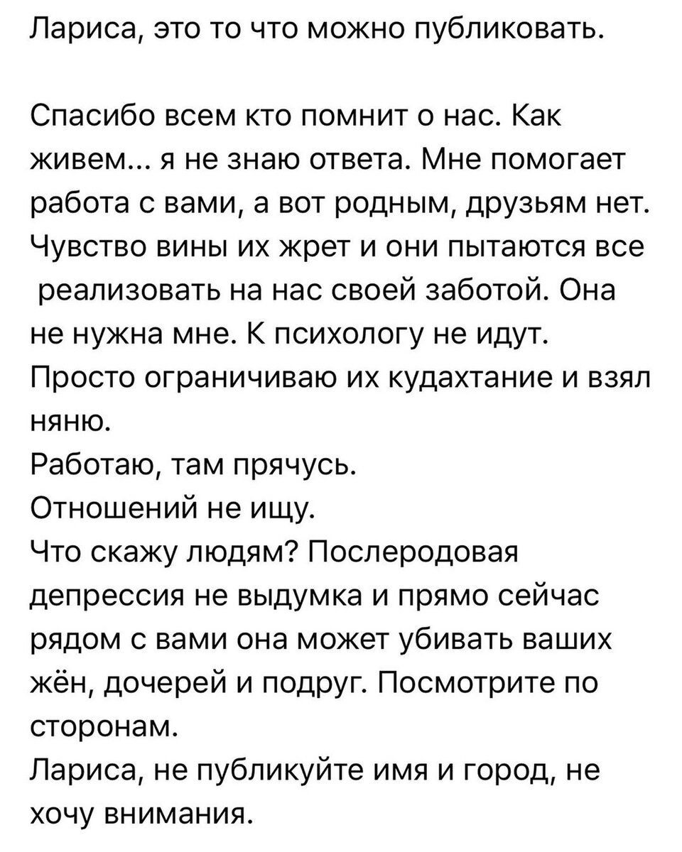 Это привет вам от автора самого трагического письма в истории моего блога. Я не буду его повторять, по просьбе написавшего. Суть проста: он не увидел, не захотел услышать симптомов послеродовой депрессии у своей жены. Ее больше нет. Вчера в Москве произошла очередная трагедия. Я давала комментарии для радио и газет, информация у всех сводится к тому, что тоже женщина говорила о депрессии, усталости, страхах. Что и как было мы не знаем, но видим итог. Я не буду твердить то, что много раз писала. Не буду даже обращаться к родным и близким. Хочу сказать НАМ всем. Возможно, сегодня вас бесит, что у соседки плачет ребёнок? Или что мама кормит малыша в музее? Или что она в самолёте летит с детьми? Или просто ваша подруга не так давно родила и вам с ней скучно или не хочется беспокоить... Друзья, товарищи, люди! Возможно то, что она сейчас пришла в музей - спасёт жизнь ей и ее ребёнку. Напишите сообщение подруге не в формате: «Ну чего, как вы?» А вот так: «Во сколько идём гулять с малышом? С
