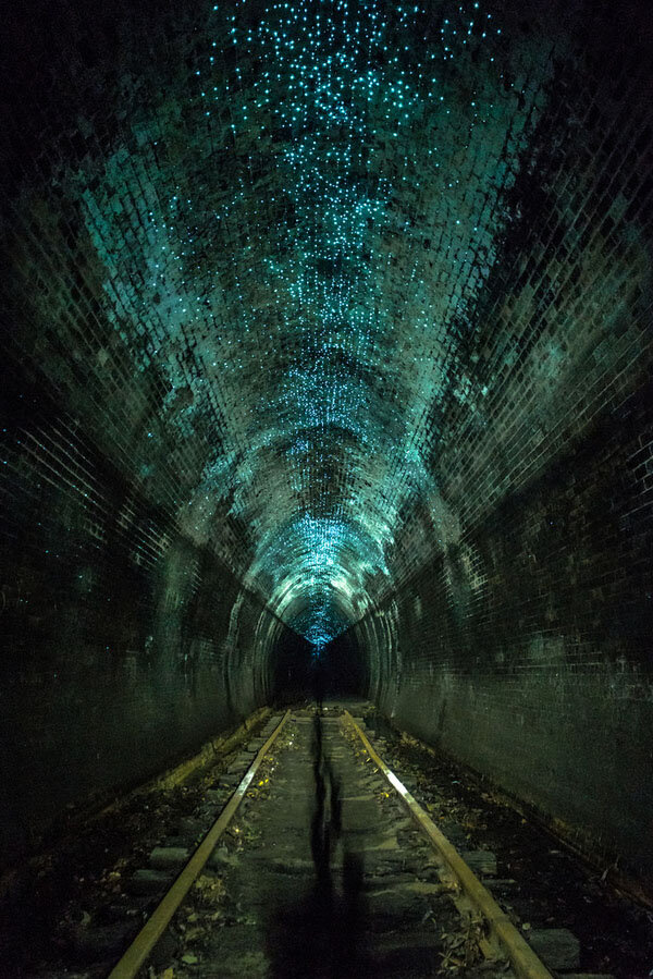 О том, что это место когда-то было железнодорожным тоннелем напоминают лишь давно заброшенные затопленные пути. Но оказавшись внутри тоннеля, в который они ведут, вас встретит очаровательное голубое свечение, настолько сильное, что буквально освещает темноту. Официально это место – железнодорожный тоннель, который был построен в 1880-х годах. Однако, уже в 1915 году он был закрыт из-за огромного количества сажи и дыма, скопившихся на его стенах, что было опасным для поездов. Другой же его выход со временем был и вовсе заблокирован. До недавнего времени тоннель был практически спрятан за непроходимой растительностью, но в 1995 году он был осушен и частично очищен. Практически сразу после этого колония светлячков - одна из крупнейших во всем Южном Уэльсе - переехала и обосновалась на крыше. Насекомые освещают тоннель, как созвездие сине-зеленых звезд.