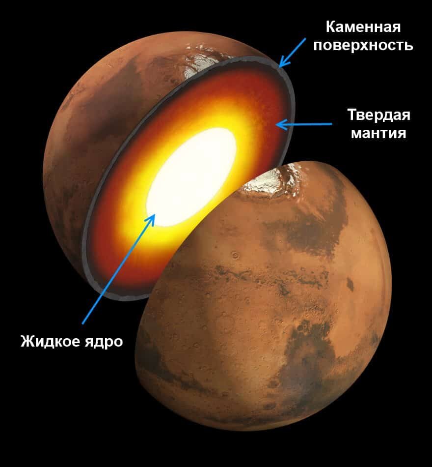 В структуре Марса присутствует плотное металлическое ядро с силикатной мантией. Оно представлено сульфидом железа и вдвое богаче на легкие элементы, чем земное. Кора простирается на 50-125 км.