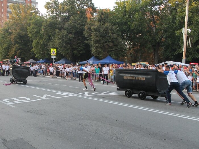 Посоревноваться с шахтинцами на традиционной в День города и День шахтёра эстафете "шахтёрских бригад" прибыли команды из Зверево, Белой Калитвы и Новошахтинска. Условия состязаний не изменились: нужно было каждому участнику каждой команды "пролезть по лаве", поработать "обушком", пробежать с тачкой - а затем уже всей "бригадой" дотянуть вагонетку до финиша. Насколько тяжёлая это штука — 700-килограммовая вагонетка (да ещё с учётом "асфальтового ландшафта" нашей улицы Советской в самом центре города) публика могла судить, наблюдая за попытками помощников переместить вагонетки назад, от финиша к старту. Даже бывший директор трёх ростовугольских шахт Пётр Орлянский едва усидел на вип-трибуне рядом с городским начальством —всё рвался помочь. Впрочем, участники всё-таки больше очков теряли на первых этапах эстафеты, чем на решающем последнем. В итоге сильнейшей вновь оказалась "бригада" из города Шахты. На втором месте — новошахтинцы, на третьем — зверевчане. Елена Шупегина www.шахты.