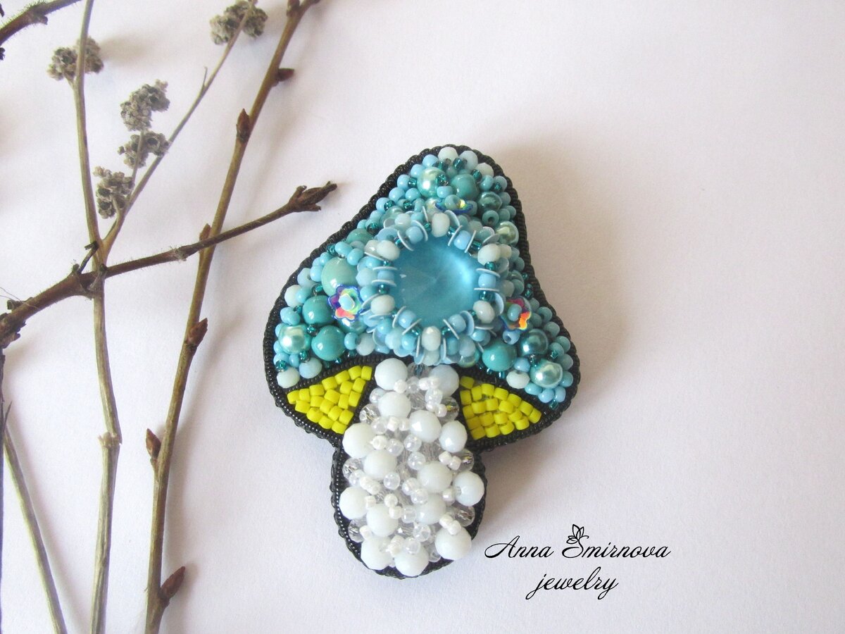 Пошаговый мастер-класс по вышивке брошки из бисера. Сегодня предлагаю сделать вот такой яркий грибок! Для работы нам понадобятся следующие материалы: Рисуем шаблон броши, примерный размер у меня 5.5 х 3.8 см. Делаем дырочки для того, чтобы легко перенести рисунок на ткань. Переносим шаблон на фетр, пришиваем фетр на подготовленные пяльцы. Канитель совсем немного растягиваем и пришиваем по контуру. Я работаю в данном случае нитью серого цвета. Начинаем вот отсюда И далее по контуру, сначала ножку, а потом внутреннюю линию. Размещаем и пришиваем кристалл. Линию вокруг кристалла разделяем на 6 частей, можно мысленно, я для наглядности отметила гелиевой ручкой. Набираем на нить три бисерины №11 одного цвета, пайетку 3 мм, рондель 2х3 мм, пайетку 3 мм, три бисерины № 11. Делаем арку способом "шаг назад". Выводим иглу. Вновь делаем набор бисера и выполняем арку. Так делаем 6 раз. Выводим иглу в верху арки, через рондель. Набираем одну бисеринку №11 (у меня оттенок бисера немного отличается
