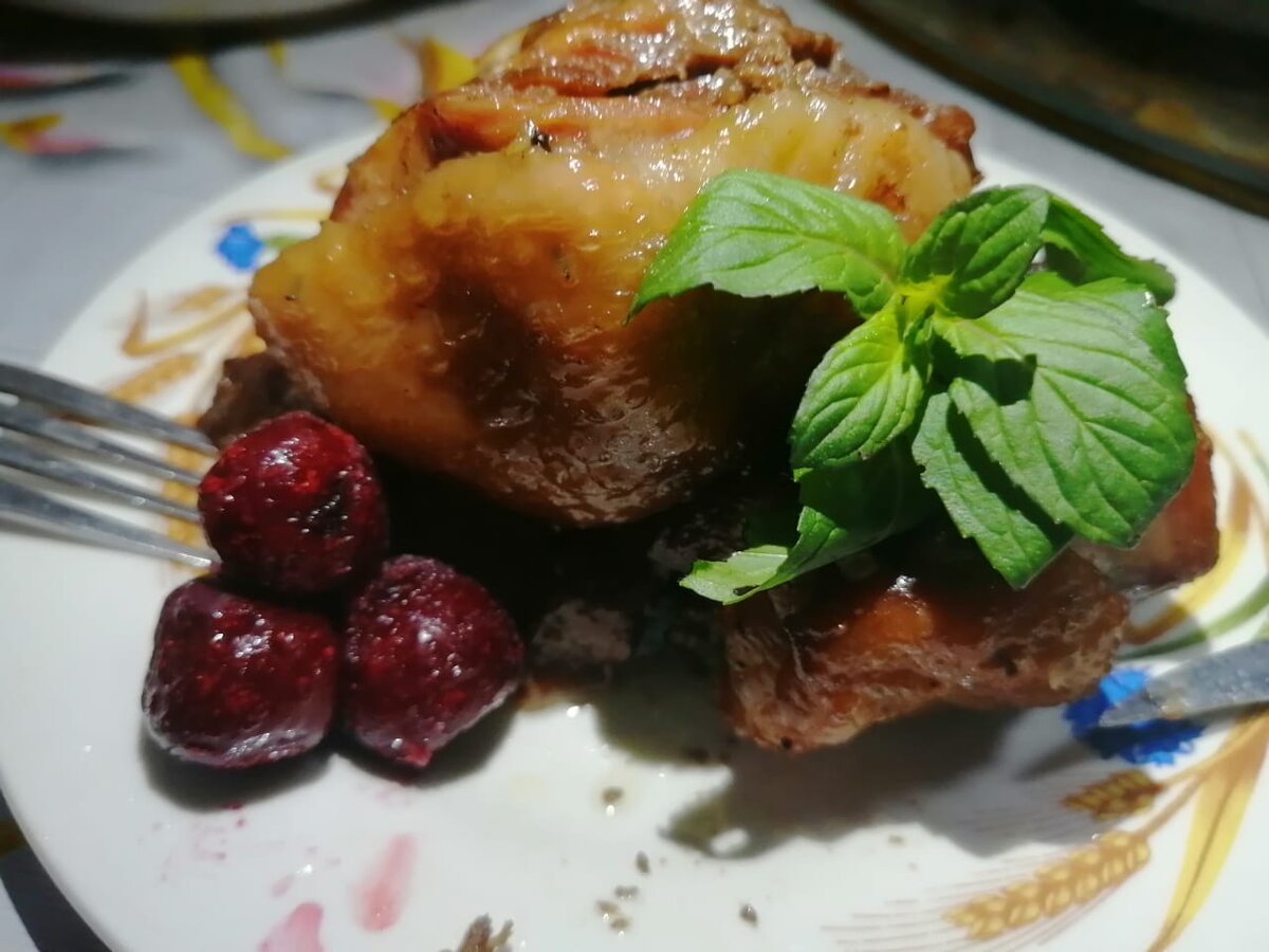 Для этого нам понадобиться бедра нарезаем порционно, солим и перчим по вкусу, после добавляем мелко нарезанный чеснок и мякоть вишневых ягод, и корицу, оставляем мариноватся. Перемешиваем мясо в маринад каждые 15 минут и так в течении часа. Выкладываем мясо в посуду для запекания и накрываем фольгой. Ставим в разогретую духовку при температуре 190-200 градусов на час, после вынимает из духовки и снимаем фольгу, после возвращаем мясо в духовку для образования красивой корочки , к мясу можно подать свежую мяту. Приятного аппетита!