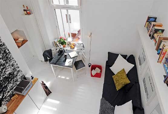 Дизайн малогабаритной квартиры может включать создание ступенчатых переходов на полу и/или потолке из одной зоны в другую, зона кухни по отношению к комнате может располагаться на небольшом «пьедестале» — приподнятом уровне. А балкон - представлять собой пространственную нишу, продолжающую комнату, но являющуюся самостоятельной зоной для работы или отдыха.
