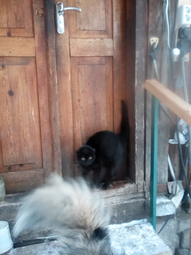 Уголек тихо и мирно сидел на крылечке, никого не трогал, вдруг мимо проходит здоровенная собачища, и прямо к нему! А вот это зря, Уголеша себя в обиду не даст и не позволит нарушить свою зону комфорта! Так что угрожающая поза и хвост трубой в сочетании с громким и злым шипением дают ожидаемый эффект, враг продолжает свое движение дальше и мимо. Только пушистым хвостом махнул на прощание. И не знает бедный котик, что у хозяина всё на контроле, пёс на поводке, но реально страшно было! А сам котишка виноват, нечего за дверь на улицу выскакивать, неприятности наживать на свой длинный хвост. Хорошо, что дальше крыльца не убежал, сидел умница под дверью, да и собака не чужая оказалась, а своя, шла с хозяином на прогулку. Вот пришел Уголек мамочке пожаловаться, она всегда утешит, оближет и молочком даже накормит. Конечно же, после улицы, таких переживаний надо покушать и отдохнуть. Дома тепло и тихо, никаких неприятностей. И не только мамочкино молочко можно покушать, но и в мисочке тоже