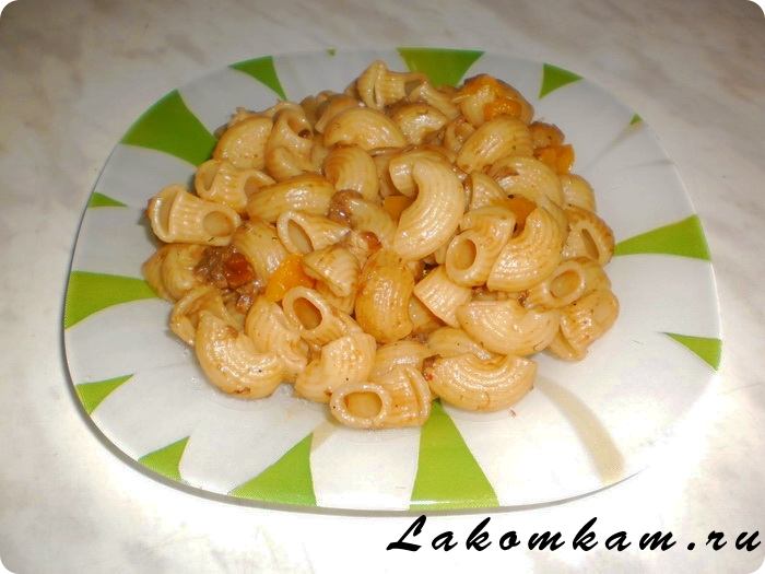Макароны по-флотски с поджаренным мясным фаршем могут есть только заядлые мясоеды. Вегетарианцам предлагаю заменить его грибами, которые почти не уступают мясу по количеству белка, но сделают блюдо на много полезнее, а его вкус пикантнее.