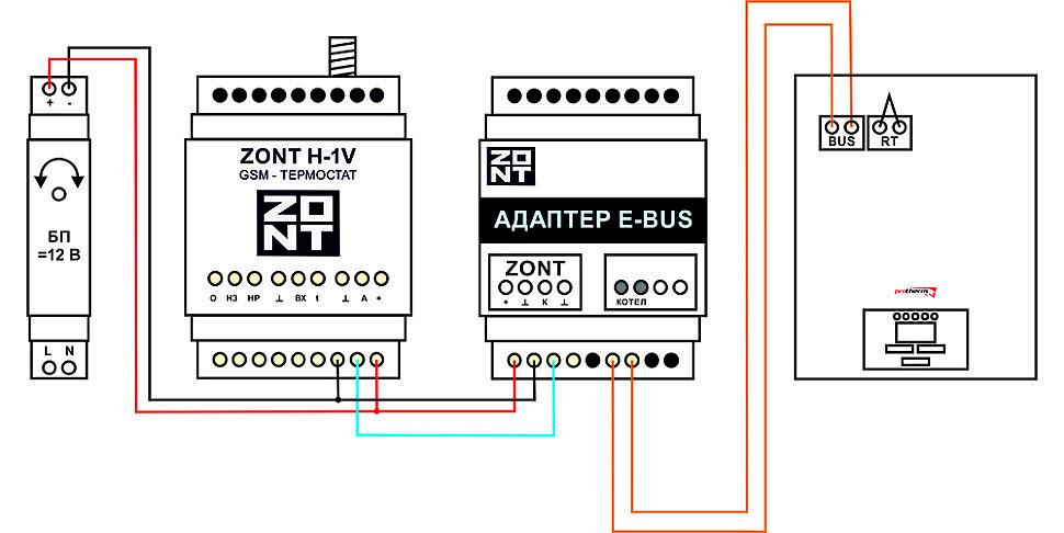 Подключение систем ZONT к котлам Protherm может выполнятся различными способами. Наиболее простой - подключение термостата в качестве простого регулятора температуры типа включил/выключил. Но наиболее правильными и полным способом является использование специальной шины данных E-BUS, применяемой в различных модификациях котлов Protherm и Vaillant. Для подключения понадобится непосредственно сам термостат ZONT (модификация не важна), а также адаптер ZONT E-BUS. Принципиальная схема подключения представлена на рисунке ниже. Обратите внимание, что неправильное подключение может повлечь за собой выход оборудования из строя или поражение пользователя электрическим током. Если сомневаетесь в своих силах доверяйте установку профессионалу! Подключение адаптера к котлу происходит к клеммам цифровой шины. Расположение клемм на конкретной модификации котла Protherm отличается, но всегда клеммы обозначены маркировкой BUS. Подключение происходит двужильным кабелем с сечением не ниже 0,5