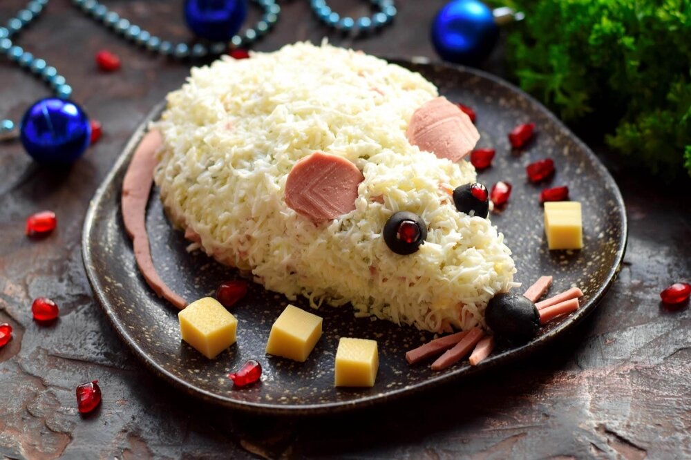 Красивая подача блюд на новогодний стол всегда создает праздничное настроение и повышает аппетит. Украшение блюд в виде символа наступающего года — отличная идея. Рассмотрим, как можно украсить всеми известный салат Оливье, без которого не обходится новогодние торжества. Здесь можно дать полную волю своей фантазии, подключить к процессу младшее поколение, ведь процесс очень интересный, а результат точно удивит гостей. Ингредиенты: Приготовление: Заранее отварите все сырые компоненты в кожуре. Картофель и морковь можно варить в одной емкости, доставая овощи из кипятка по мере приготовления. Картофель варите примерно 20-30 минут после кипения воды, в зависимости от размера и сорта плода. После варки картофель полностью остудите, счистите верхний слой, нарежьте одинаковыми кубиками среднего размера, закиньте в глубокую емкость. С морковью поступите аналогично картофелю, также закиньте в емкость. Колбасу отделите от пленки, нарежьте средним кубиком. Часть колбасы оставьте для украшения. Со