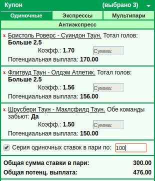 Всех приветствую! Вчера сыграли 4 ставки, кто ставил одиночными мог заработать. Например, если Вы поставили бы по 100 рублей, то получили бы 648. 648 - 500 =148 или 29% Прогноз на сегодня. Англия. Трофей футбольная лига Shrewsbury - Macclesfield > over (Больше 2.5) Bristol Rovers -Swindon Town > over (Больше 2.5) Fleetwood Town - Oldham > goal (Обе забьют) Статистика за прошедшую неделю - здесь Все актуальные прогнозы на моем канале и в соц.сетях - подписывайся! Всем удачи!