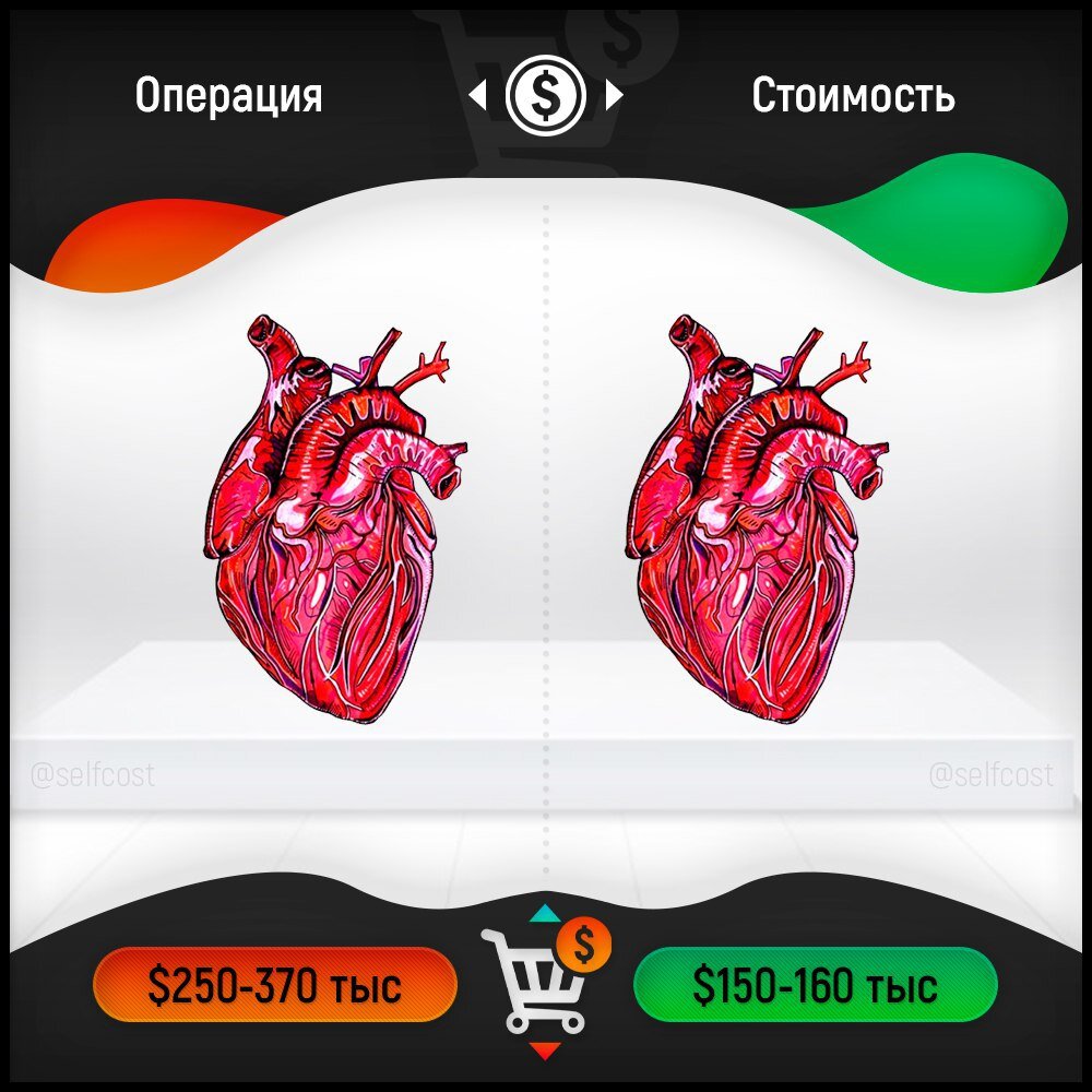 Сколько стоит сердце? Сколько стоит сердце? Самым дорогим органом является именно сердце человека, поэтому многих интересует, сколько стоит этот орган на самом деле. Официальные данные подтверждают, что речь идет о 150-160 тысяч долларов. Операция по трансплантации стоит очень дорого во всём мире. Её стоимость зависит от того, где находится клиника и от её статуса. На цену влияет и количество таких операций, ежегодно проводимых врачами — согласно мировому рейтингу. Цена трансплантации составляет от 250 до 370 тыс. долларов. Поскольку продавать органы человека нельзя, пересадку делают только после смерти донора, на основании письменного согласия его родных и близких. Пересадка сердца в России стоит дешевле, но получить донорский орган у нас гораздо труднее.