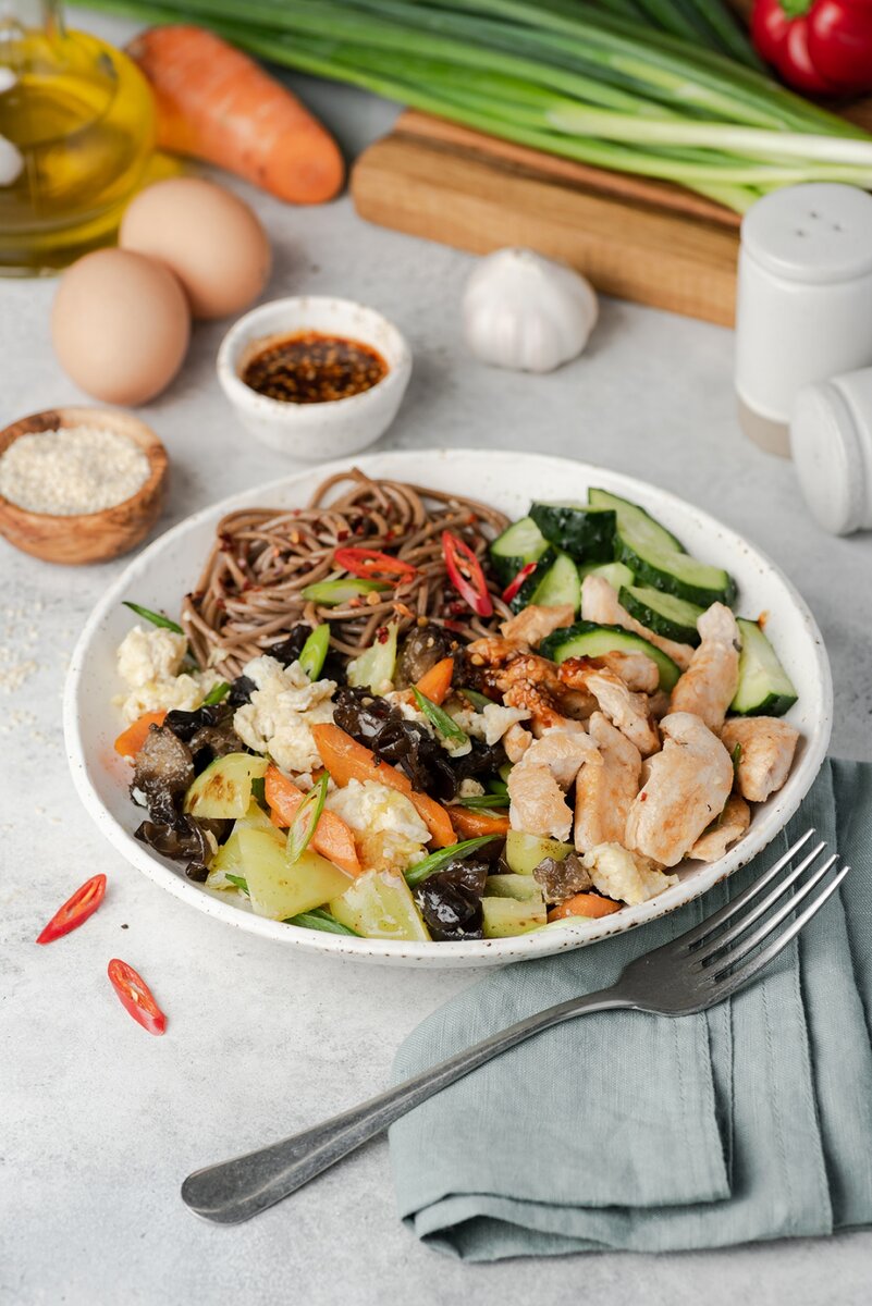Помешиваем 1 минуту и снимаем с огня. Зеленый лук моем, режем перьями наискосок и добавляем в сковороду. Перемешиваем. На тарелку кладём лапшу, курицу и китайский омлет. Соусом бибимбап поливаем блюдо.