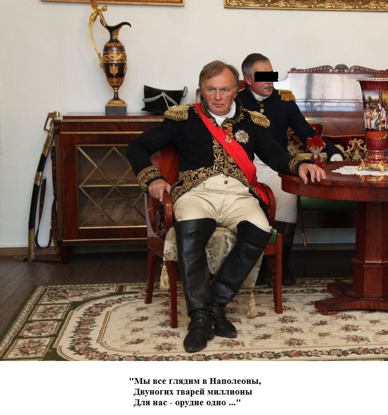 - во-вторых, историк занимался историческими реконструкциями, наряжался в мундир Наполеона и, как говорят, считал себя таковым. «Псих, играющий в ролевые игры». Великовозрастное дитя, не наигравшееся в солдатики;