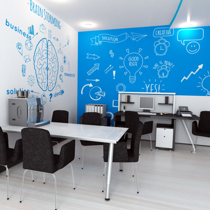 Даже любимая работа может вызывать отвращение, когда большую часть времени нужно находиться в скучных стенах. Поэтому выделите немного времени и избавьте себя от безликого пространства. 1. Виниловые наклейки и трафареты Это один из самых бюджетных и быстрых способов преобразить помещение. Наклейки хорошо ложатся на однотонно выкрашенные стены. К тому же велик выбор: начиная от размеров, заканчивая формами. Главное определиться с тематикой и учесть деятельность компании. 2. Картины Этот предмет интерьера вы можете либо купить, либо сделать своими руками. Если вы всё-таки решили включить фантазию, то мы вам поможем. Вам понадобятся: На полотне с помощью скотча создаёте любые геометрические фигуры и закрашиваете их любимыми цветами. 3. Книжные полки Эта интеллектуальная классика, наверное, никогда не выйдет из моды. Вы можете выбрать обычные стеллажи и заставить их профессиональной литературой, а зону ожидания клиентов разбавить художественной. Кстати, чтобы подборка книг не выглядела ун