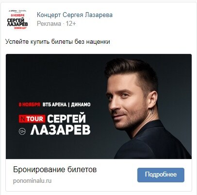 Концерт Сергея Лазарева ВТБ Арена — Центральный стадион «Динамо» имени Льва Яшина Задача: прогнать максимальный трафик и максимум показов. Конкретных задач по количеству продаж не стояло Рекламный бюджет: 167 000 рублей