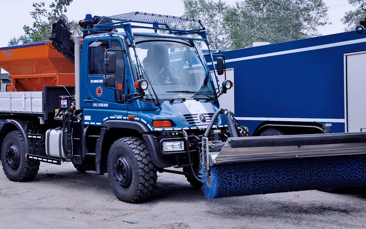 Точно указать тип этой машины не представляется возможным: при полной экипировке навесным оборудованием она, меняя время от времени одни агрегаты на другие, в одиночку способна справиться с большинством видов коммунальных работ — разумеется, если ей управляет опытный оператор. Сходная многофункциональная машина разработана конструкторами Mercedes-Benz для решения задач на местности с любым рельефом, включая полное бездорожье. Уборка снега, мойка улиц, быстрая транспортировка тяжелых грузов, спасение людей в чрезвычайных ситуациях — все это по силам универсалу под названием UNIMOG U400. Если вечером машина боролась со льдом, распределяя противогололедные реагенты, а ночью пошел снег — утром можно быстро заменить оборудование на снегоуборочный комплект, и снова браться за работу. Для мойки сильно загрязненных улиц и дорог у UNIMOG U400 имеются аппараты высокого давления; привод оборудования осуществляется от мощного переднего вала отбора мощности. Для UNIMOG U400 существует десяток вариантов комплектации и еще большее число возможных комбинаций. Простейший — машина для перевозки грузов, востребованных в коммунальной сфере. Для летней уборки улиц техника оборудуется подметальными устройствами, передними и задними навесными щетками, поливочным оборудованием, имеется даже особый комплект для мытья тоннелей, знаков, указателей и прочего подобного. Для уборки зимней для нее предусмотрены плужные, шнекороторные снегоочистители, распределители антигололедных реагентов и даже снегоплавильная станция. Для работы на трассе машину экипируют оборудованием для мытья шумозащитных стенок, столбиков, колесоотбойного бруса. Машина отлично справится с растительностью на обочинах и во дворах, для этого у нее есть оборудование для кошения травы, удаления сорняков и измельчители древесины, ножничные и дисковые фрезы для обрезки сучьев. Для обслуживания городского освещения и содержания фасадов зданий на машину можно установить подъемник с корзиной. Оборудование для ямочного ремонта дорог — от мини-экскаватора и фрезы до гудронатора — с ней также отлично сочетается. И наконец, UNIMOG U400, если это необходимо, может выступить в роли аварийного автомобиля — разработчиками предусмотрена установка на его шасси надстроек, превращающих его в машину, пригодную для тушения пожаров и ликвидации других чрезвычайных происшествий. Нужно сказать и о самом шасси универсального автомобиля. Оно выпускается с колесной базой двух типов — 3080 и 3600 миллиметров. UNIMOG U400 с постоянным приводом на все колеса с блокировкой межосевого дифференциала оснащен силовым агрегатом мощностью 231 л.с. и топливным баком объемом 195 литров. КПП коммунального автомобиля имеет 8 передних и 6 задних передач; на машину установлено однодисковое фрикционное сцепление. У машины прямая сплошная лестничная рама, портальные мосты и телескопические амортизаторы переднего и заднего мостов. Разработчики снабдили автомобиль системой автоматической поддержки заданной скорости и массой других полезных опций вроде электронной системы менеджмента с функцией диагностики, передней балкой для установки переходной плиты для крепления навесного оборудования. Что касается кабины UNIMOG U400, она выполнена из композитного синтетического материала на стальной несущей раме, соединенной с рамой шасси. Эта