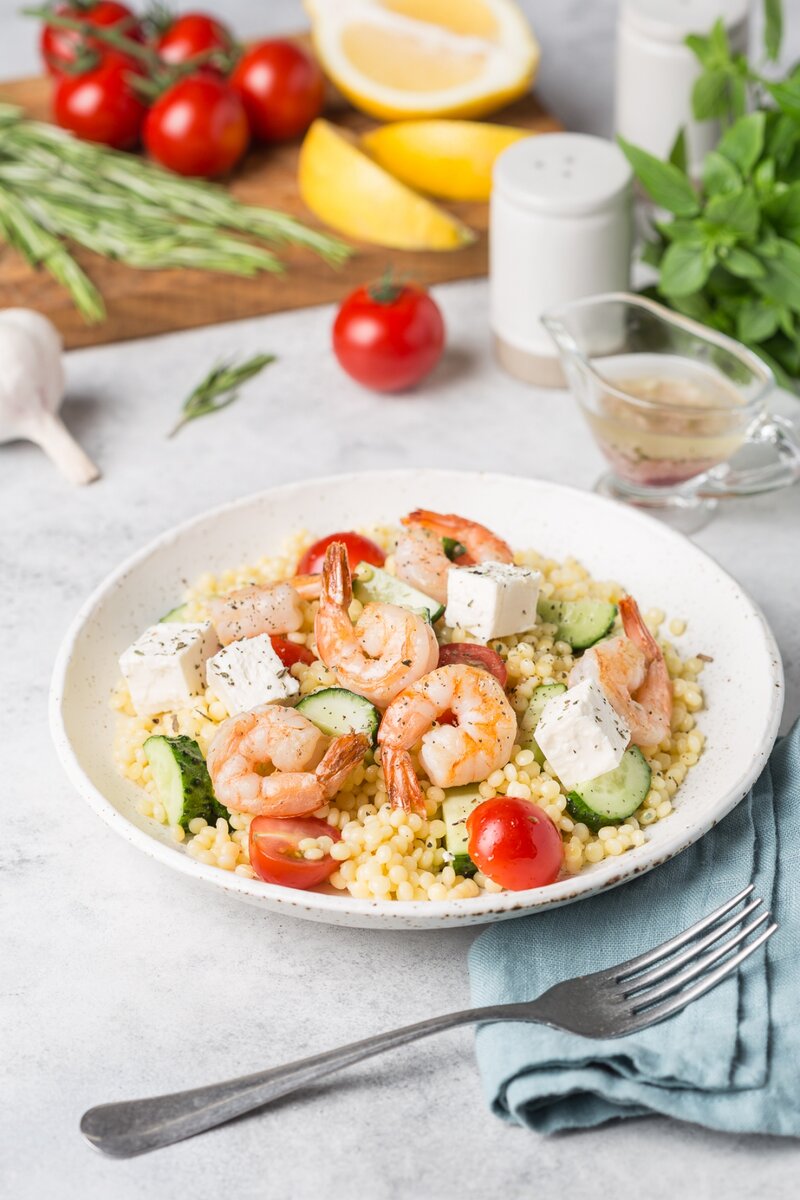 ✔️ Как подать? С креветками, брынзой, свежими овощами, лаймовой заправкой и специями – орегано и сумахом. А ещё