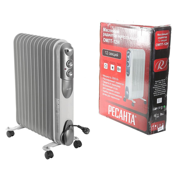 Масляные радиаторы, представленные сегодня на рынке, состоят из специальных секций, заполненных минеральным маслом, которое разогревается при помощи электронагревателя. Основным критерием выбора, наряду с мощностью самого устройства, является также количество секций из которых состоит аппарат, ведь чем их больше, тем обширнее площадь соприкосновения греющей поверхности с воздухом и, соответственно, выше интенсивность теплообмена. Различают среднесекционные и высокосекционные приборы, каждый из которых оптимальнее подходит для помещений различной площади. Ресанта ОМПТ-12Н, имея в своей конструкции максимально доступное количество ребер, составляющее 12 штук, а также высокую мощность нагревательного элемента, является высокопроизводительным устройством, способным оперативно обогреть достаточно большое пространство. Для того, чтобы масло, расположенное внутри, разогрелось до нужной температуры, потребуется до 20 минут, но когда аппарат полностью прогреется, высокая теплоотдача компенсирует затраченное время и оперативно поднимет температуру воздуха до желаемой.