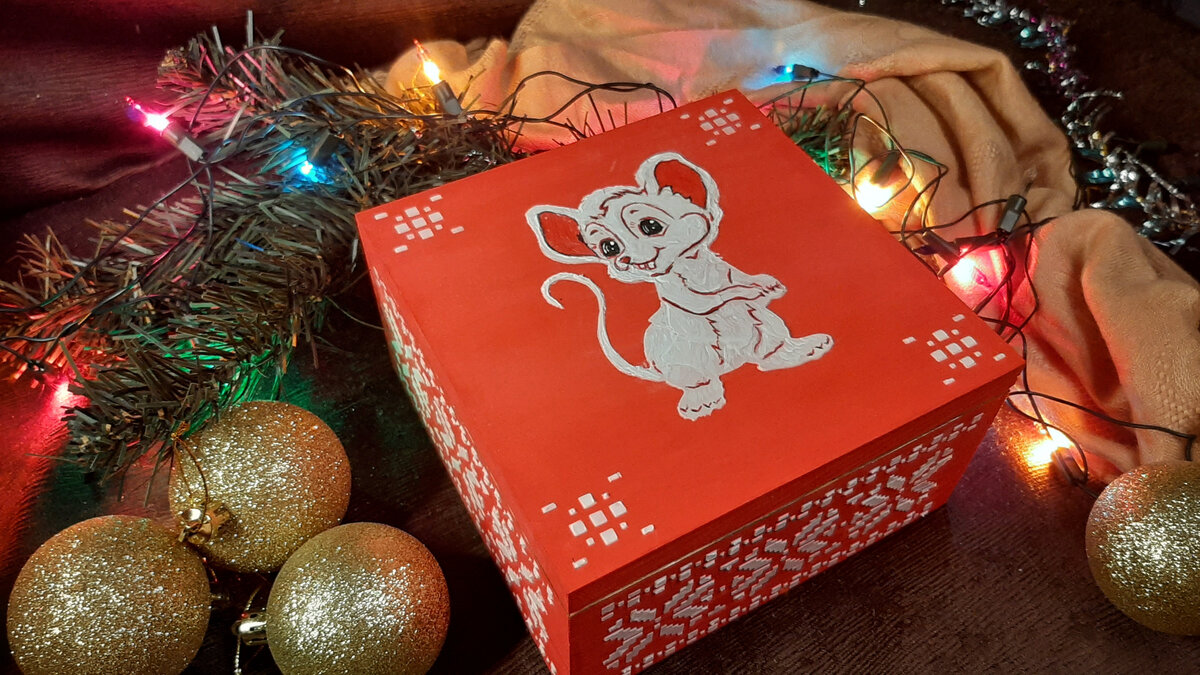 Всем привет! Меня зовут Екатерина, я художник-видеоблогер. Веду свой YouTube канал под названием "TessaArt" :) Сегодня я расскажу о этапах декорирования новогодней шкатулки с мышонком! Материалы: Все этапы я показываю в видео (ссылка в конце статьи), так как фото были бы не очень информативны. А тут я расскажу про этапы. 1. В начале необходимо загрунтовать заготовку. Но если она у Вас шероховатая, то сначала пройдитесь наждачной бумагой. Грунтовала я в несколько тонких слоёв, чтобы поверхность оставалась ровной и равномерно окрашенной. Каждому слою давала просохнуть 20-30 минут. Кстати использовала плоскую синтетическую кисть. 2. Второй этап нанесение акриловой краски (даже не пытайтесь использовать гуашь, ведь она смывается водой). Её так же лучше наносить в три-четыре тонких слоя, тогда не останется волн. 3. Третий этап нанесение узора через трафарет, с помощью текстурной пасты. Кстати трафарета мышонка у меня не было, так что я сделала его сама из листа картона (нанесла силуэт н