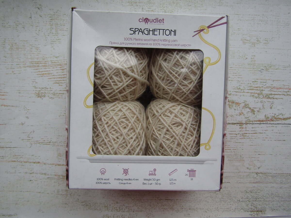 Влюбилась в "макаронную" серию пряжи. Ношу шапку из "Макарони" с огромным удовольствием. Недавно купила похожую пряжу для шарфа. Название оригинальное "Спагеттони". Пряжа упакована в коробку. Богатая цветовая палитра, очень хочется джемпер из такой пряжи. Скорее всего для джемпера куплю цвет "графит". С трудом открыла коробку, сначала не поняла в каком месте она открывает. Крышка была приклеена к основной части прозрачной плёнкой. В упаковке четыре мотка. Нить местами неровная, но на качестве вязаного полотна это не отражается. Шарф решила связать "английской резинкой". Производитель рекомендует спицы номер 4, я взяла 4.5. Полотно показалось слишком "рыхлым", всё-таки шарф должен быть плотным и тёплым. Полотно просвечивает. Вязать из мотков пряжи неудобно, нить скручивается. Пряжу стоит смотать в клубок и в процессе вязания клубок должен находиться в корзине или коробке, важно чтобы нить была натянута. Решила попробовать спицы номер 4, на первый взгляд полотно нормальное. Немного п