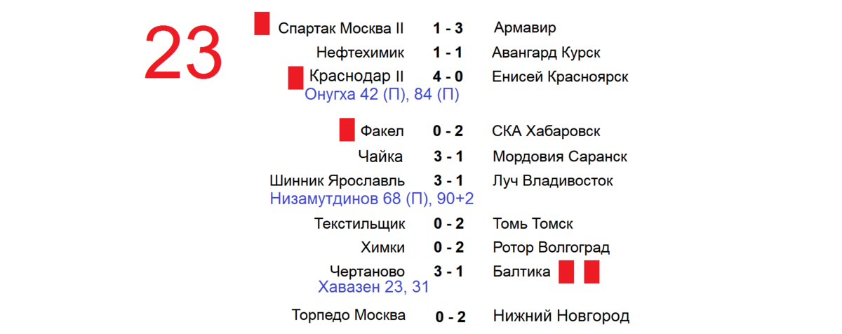 Сегодня провел 23 тур в ФНЛ. В этом обзоре результаты, расписание, турнирная таблица и бомбардиры. Самый популярный счет - 0:2 (4 матча) и 1:3 (4 матча). Три футболиста сделали по дублю: Онугха (Краснодар 2), Низамутдинов (Шинник), Завазен (Чертаново). Таблица. Лучшие бомбардиры Подписывайтесь на обзоры от "спортивного", если они вам были полезны. Рекомендую: 6 ЛУЧШИХ сборных за всю историю рейтинга FIFA. https://zen.yandex.ru/media/id/5ba8b371584c1f00aa3da1ef/6-luchshih-sbornyh-za-vsiu-istoriiu-reitinga-fifa-kto-byl-na-pervom-meste-i-skolko-raz-5dc92d3ce8c8e22cded833f0