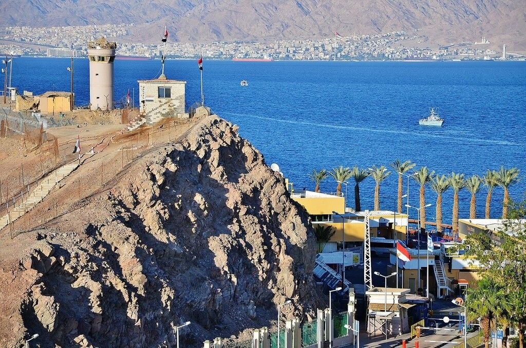 На этой фотографии видны египетский и израильский (башенка) наблюдательные посты, израильский патрульный катер, пограничный терминал внизу и даже иорданский город Акаба на противоположной стороне залива -