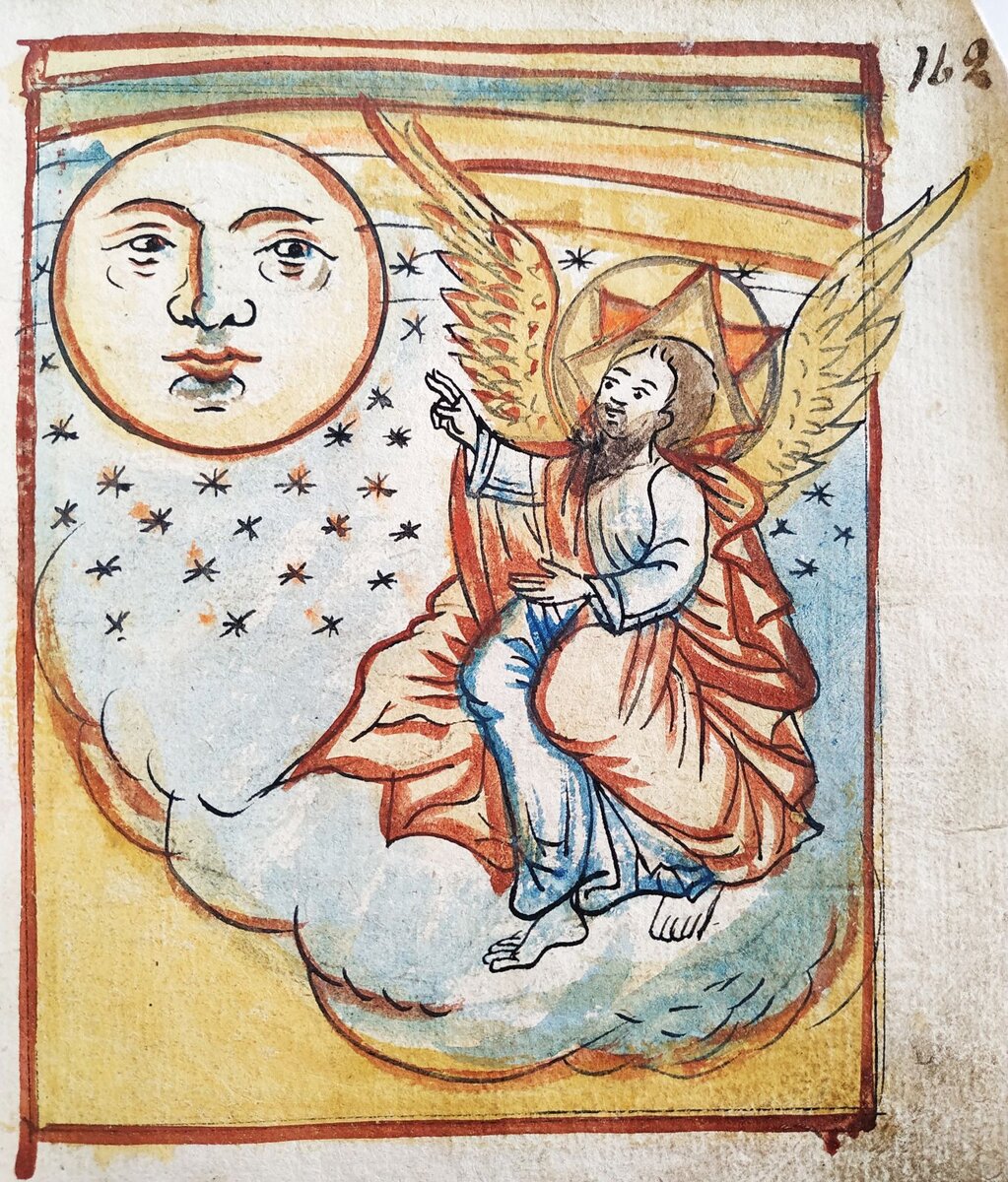 ОЛДП Q. 11, л. 161 На этом рисунке Господь благословляет луну и звезды: И Бог сказал: «Да будут светила на небесном своде, чтобы отделять день от ночи, и пусть они служат знаками, чтобы различать времена, дни и годы, и пусть они будут светильниками на небесном своде, чтобы светить на землю». И стало так. Бог создал два великих светила – большое светило, чтобы управлять днем, и малое светило, чтобы управлять ночью, а также Он создал звезды. Бог поместил их на небесном своде, чтобы они светили на землю, управляли днем и ночью и отделяли свет от тьмы. Бог увидел, что это хорошо. Был вечер, и было утро – день четвертый. Второй из приводимы