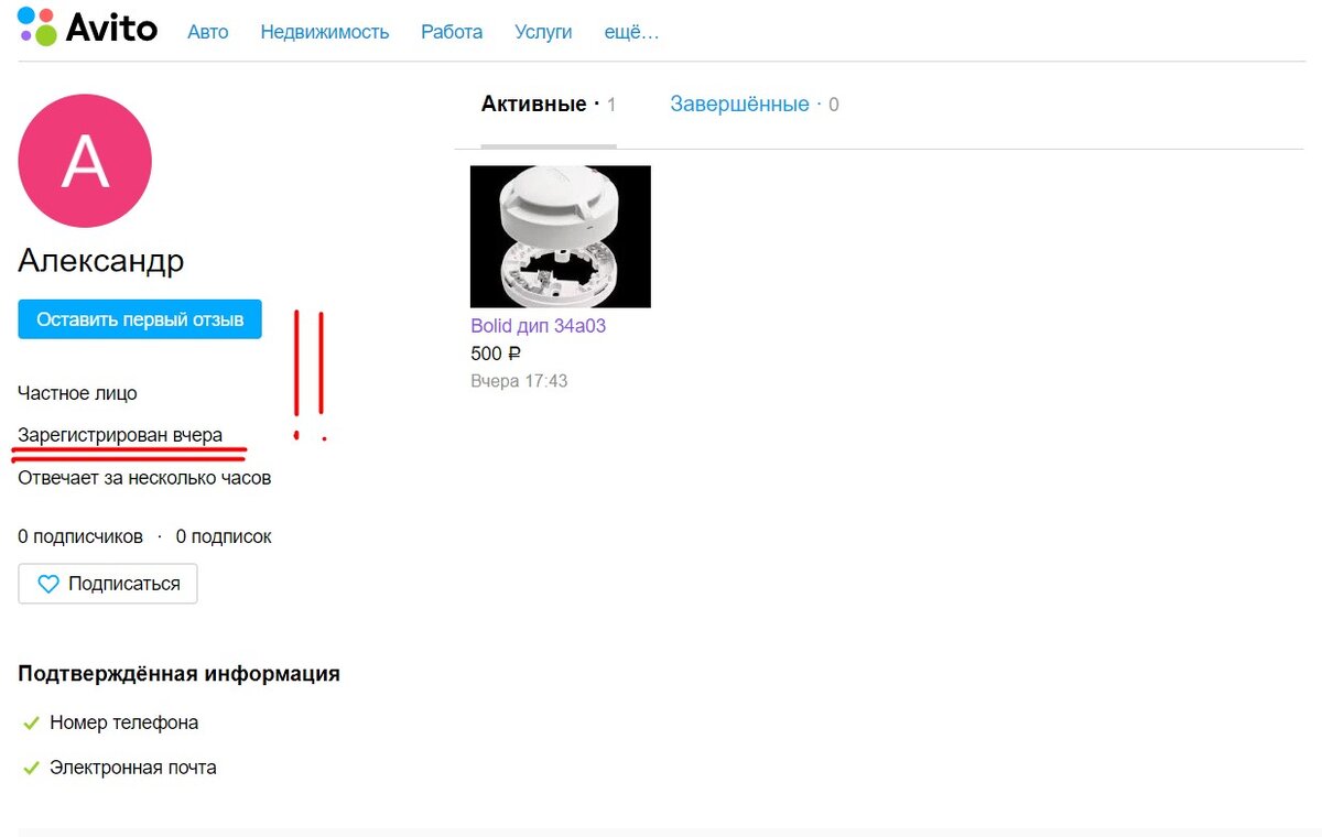 1. Регистрируется новый аккаунт в Авито. Дата создания свежая.