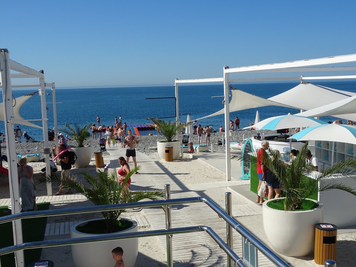 Отдыхали в этот бархатный сезон в Адлере. Точнее в её Олимпиской части, в Имеретинке. Все пляжи тут бесплатные, свободный доступ. Платно только лежаки, зонтики и прочие услуги. Но один пляж был платный. Песочный пляж от отеля Radisson Blu Resort. Для состоятельных постояльцев отеля бесплатно - они расхаживали в фирменных халатах. Для любого другого - 2500 руб. в день. Песочек, лежак, шатер, душ, детская игровая зона к твоим услугам. Вот такой спуск. Здесь многие с детьми на колясках проходили, проход через пляж открыт для всех. Вот такой специально завезенный песочек и уютные шатры. Но шибко ажиотажем не пользовался он в бархатный сезон. Барная стойка рано утром. А так обычно пару барменов тут тусуется постоянно Вот такие опрыскиватели освежающие каждые несколько минут орошают :) Песочка завезли с запасом. Тут и на волейбольная и на футбольную площадку хватило. Здесь все бесплатно - играй сколько хочешь, даже очередь образовывалась. Вот тут видно как уже за оградкой, на бесп