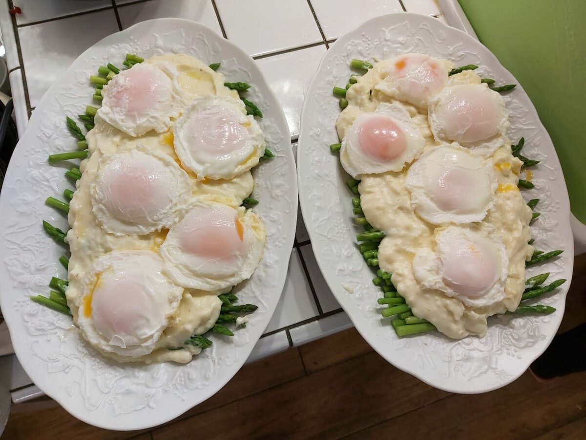 Наши домашние попытки освоения французской кухни в выходные — яйца пашот со спаржей и соусом бешамель. ⠀ Вообще это блюдо подают с соусом голландез, но наши домашние его не очень любят. ⠀ Поэтому мы готовим бешамель — на сливочном масле обжариваем муку, добавляем соль, перец, мускатный орех и вливаем, помешивая, молоко, пока соус не станет той густоты, которая нам нравится. ⠀ У спаржи отрезаем жесткие кончики, слегка ее варим в подсоленном кипятке и откидываем на лед, чтобы не потеряла цвет. Можно вместо спаржи взять брокколи или зеленую фасоль. ⠀ Ну, и, собственно, яйца пашот. Кипятим воду, потом делаем самый маленький огонь, чтобы вода еле-еле пузырилась, добавляем пару капель уксуса и опускаем в воду разбитое яйцо. ⠀ Дальше — соус на спаржу, яйца на соус — приятного аппетита! ⠀ #воскресныйужин