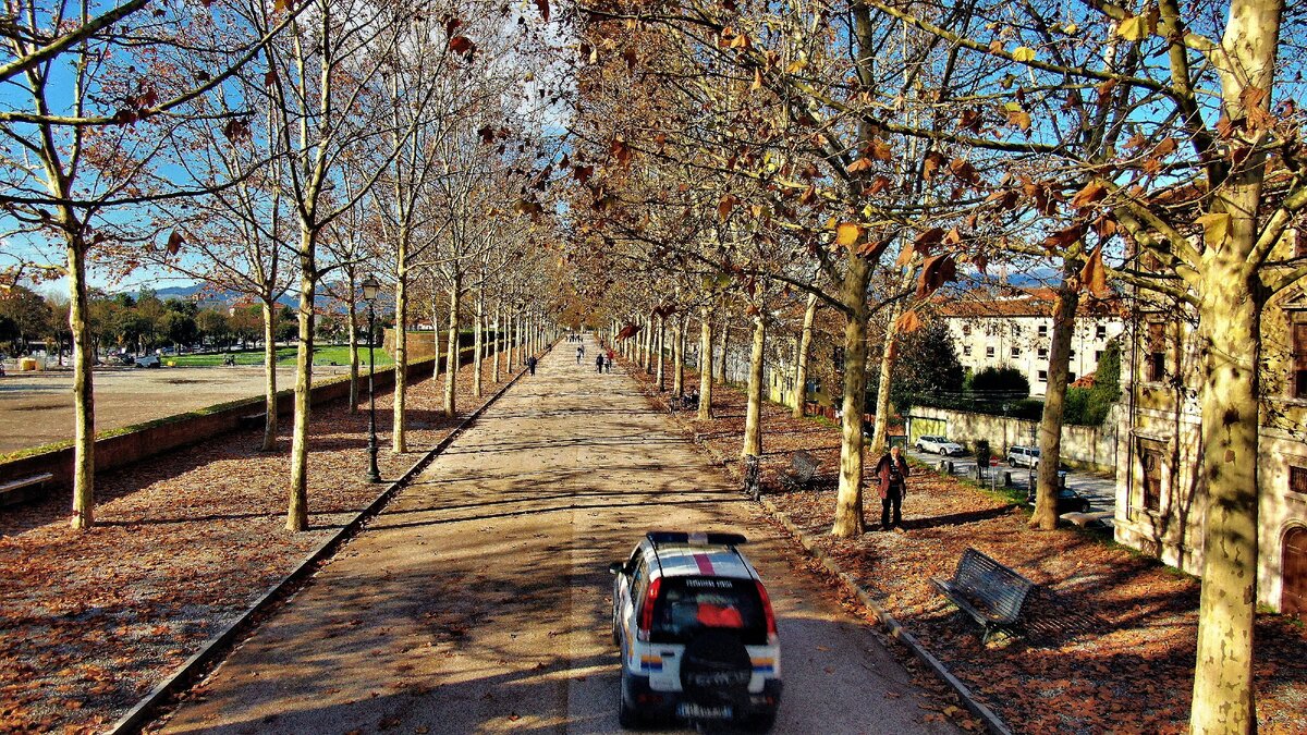 Да простят меня мои читатели, но к этим фото будет минимум описания. Во-первых нет времени много писать, через 15 минут самолёт, а фото прямо свежие и не поделиться ими преступление дзеновоского маштаба. Во-вторых тут особо слова не нужны. В Тоскане наступила осень и закончились проливные дожди, про которые недавно трубили все новостные каналы и по этому случаю скидывали миллионы русские олигархи на спасение Венеции. По городской стене в Лукке можно сново бегать и ездить на скоростном велосипеде. Листья на деревьях опали, но не везде. На укреплениях еще держатся и газон всё еще зелёный. Не сморя на полностью закрытое небо над Луккой удалось немного полетать над городом и снять интересные ракурсы, недоступные с земли. Ещё недавно по этой крепостной стене могли передвигаться автомобили, а теперь это полностью пешеходная и вело зона. Если оббежать городскую стену по кругу, то «набежит» 4 км, простите за тавтологию. Надо сказать, что бегающих и наматывающих круги на велосипеде не мало
