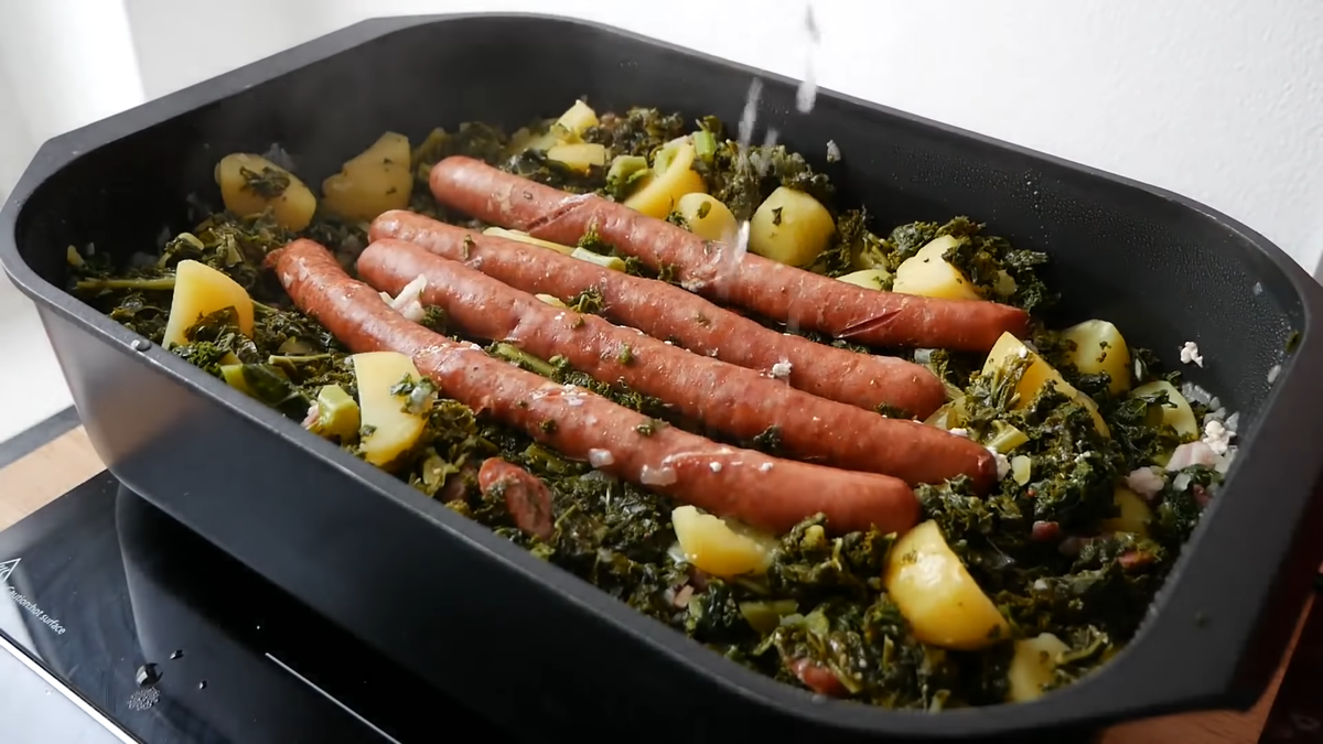 Солю, перчу, добавляю несколько кружочков порезанной колбаски. тушу примерно 10 минут, затем добавляю колбаски целиком.