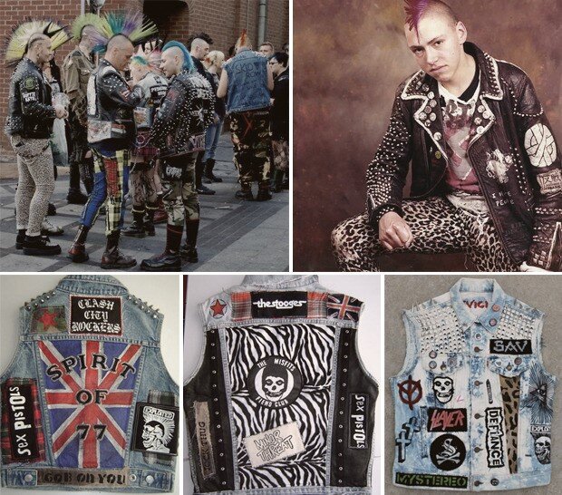 Панки не только украшали свои головы разноцветными ирокезами, но также активно использовали в декорировании рваной одежды различные знаки отличия: