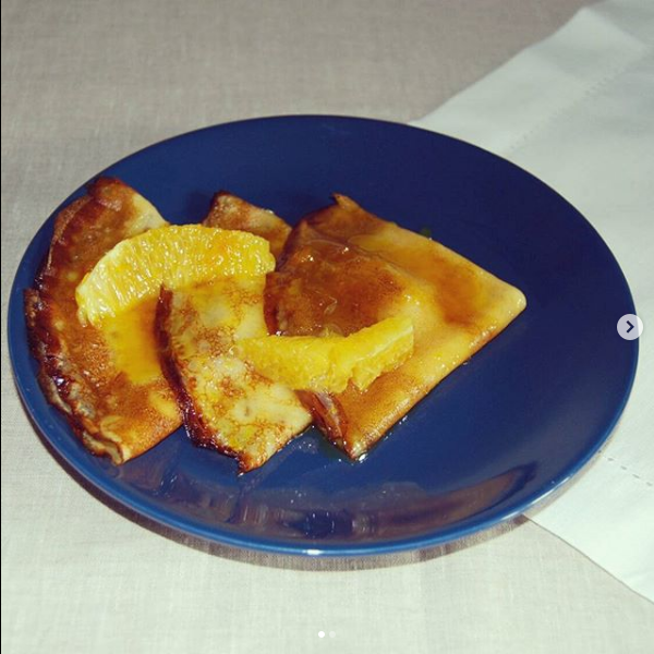 5 ст. л. апельсинового ликера Смешайте в миске муку, сахарную пудру и соль. Добавьте яйца, масло и часть молока, перемешайте до однородности. Добавьте остальное молоко и хорошо перемешайте. Испеките блины. Для соуса растопите масло и сахар в сковороде, доведите до кипения и готовьте около 3 мин, пока сахар не потемнеет. Добавьте апельсиновый сок, апельсиновую цедру и варите до загустения. Влейте апельсиновый ликер и уменьшите огонь. Положите один блинчик в соус, переверните. Сложите блинчик вчетверо. Повторите с ос