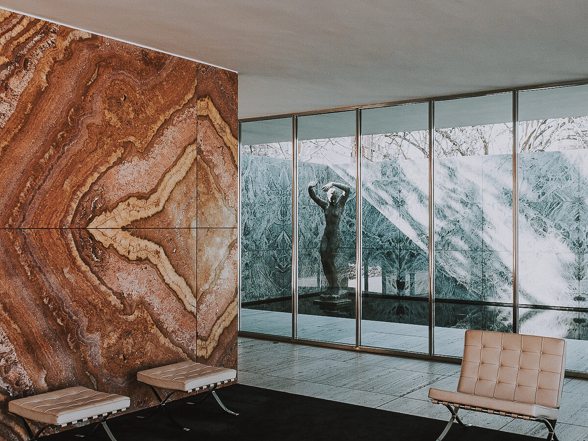 С 1930 по 1933 год Мис ван дер Роэ был директором школы Баухаус. Годом ранее он построил павильон Германии на Всемирной выставке в Барселоне. В нем не было дверей и замкнутых помещений, а центром композиции являлась скульптора Георга Кольбе «Утро». Кроме нее, в павильоне отсутствовали выставочные экспонаты — экспонатом, по задумке автора, был сам павильон. В архитектуре преобладали прямые линии, в пространстве было много воздуха и света. Для внутренней отделки использовались натуральные материалы: оникс, мрамор, травертин. Комплексную реставрацию провели в середине 1980-х годов.