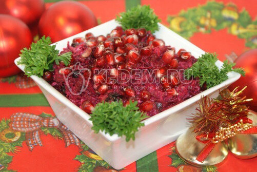 Салат со свёклой «К Празднику» Ингредиенты: Способ приготовления: 1. Свеклу отварить, остудить и натереть на терке. Выложить в миску тертую свеклу и сыр. 2. Добавить чернослив некрупно нарезанный. 3. Заправить майонезом. 4. Выложить в салатницу, украсить зернышками граната и зеленью. Салат с курицей «Праздничное оливье» Ингредиенты: Способ приготовления: 1. Куриную грудку отварить, остудить и разобрать мясо и кости. 2. Картофель и морковь отварить, остудить и очистить. 3. Яйца отварить и очистить, огурцы нарезать кубиками. 4. Овощи нарезать кубиками и сложить в миску с огурцами и горошком. 5. Добавить мелко нарезанное мясо и нашинкованные яичные белки. 6. Заправить майонезом и посолить по вкусу. 7. На плоское блюдо установить стакан по краям выложить салат кольцом. 8. Сверху посыпать тертыми желтками и убрать в холодильник на 2 часа. 9. Украсить перед подачей, отварной морковью, ломтиками огурца и лимона. ПРИЯТНОГО АППЕТИТА!СЧАСТЛИВОГО НОВОГО ГОДА!