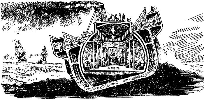 Проблема морской болезни - вовсе не проблема, скажут вам бывалые моряки. Но согласиться с ними не могли прежде всего судовладельцы, для которых из-за подобных "не проблем" огромный рынок пассажирских перевозок, особенно в "доавиационные времена", оставался не освоенным. А как быть с так полюбившимися современным заграничным пенсионерам круизами? - Да никак. Если бы конечно не одно "НО" - прогресс и деньги, которые мореходные компании готовы были инвестировать пачками, дабы привлечь более привередливую публику. Первыми изобретениями, которые устраняли, ну скажем честно частично устраняли, морские волнения. Самые чувствительные поперечные колебания устранялись за счет того, что пассажирский отсек корабля был подвешен на специальные стальные канаты и свободно перемещался в свободном пространстве корабля, как на картинке. Надо сказать способ тот еще, ведь есть явление резонансных колебаний, когда определенная частота одних может порождать усиление других, потом техническое обслуживание та