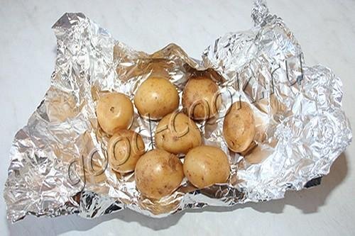 Завернуть картофель в фольгу. Запечь до мягкости при t=200°C - 40~60 минут.