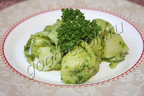 Крахмалистая мягкая картошка и хрустящий лук дополняют вкусы друг друга. СОСТАВ 400г картофеля, 50~70г петрушки, 2/3 ч ложки соли, перец, 50г воды, 4 ст ложки растительного масла (~70г), 1 маленькая луковица (40г), 1,5 ст ложки винного или яблочного уксуса 3~4% (25г), 1 ч ложка горчицы, 0,5 ч ложки сахара, 1 маленький солёный огурец (~60г), 1 ст ложка каперсов посмотреть калорийность»