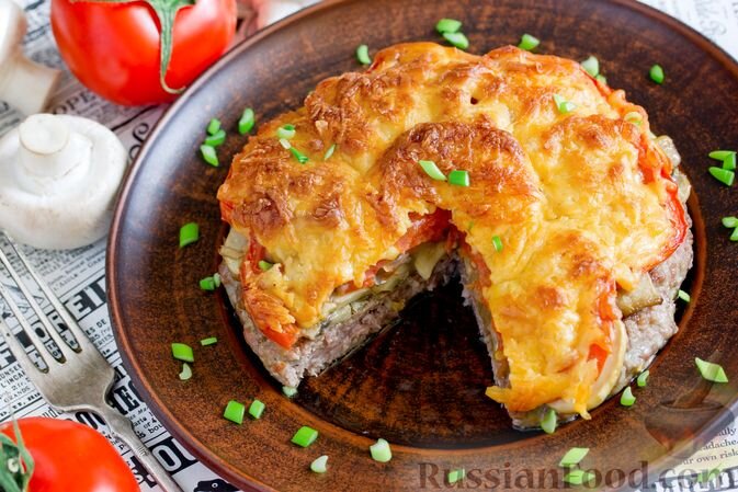 Большая котлета, запечённая с грибами, помидорами и сыром