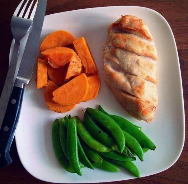 • Обед = углеводы + белок + клетчатка. Например, гречка с запеченной курицей + овощной салат.