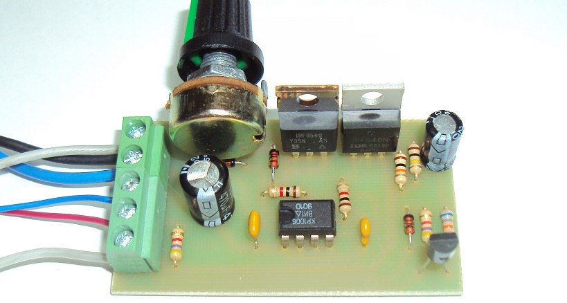 Устройство, позволяющего регулировать яркость светодиодных устройств (лампы, ленты, светодиоды), рассчитанных на питание от напряжения 12 – 14 вольт с плавным розжигом и плавным угасанием яркости.