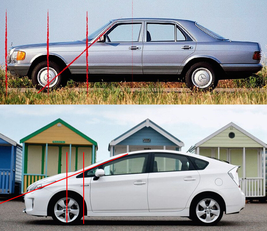 «Расстояние престижа» это расстояние между передней осью и лобовым стеклом (в английском его обозначают термином dash-to-axle) — главный дизайн-фетиш современности — он определяет дороговизну внешнего вида. Строгой нормы тут нет, важно куда попадает линия, продолжающая стойку лобового стекла. Престижно если она целит в ступицу переднего колеса, но высший класс — если в пятно контакта. Это соотношение формирует визуальный размер моторного отсека, а чем он длиннее, тем, как известно, респектабельнее автомобиль. Тут мимо, как видно на картинке ниже – расстояние престижа у приуса минимальное.