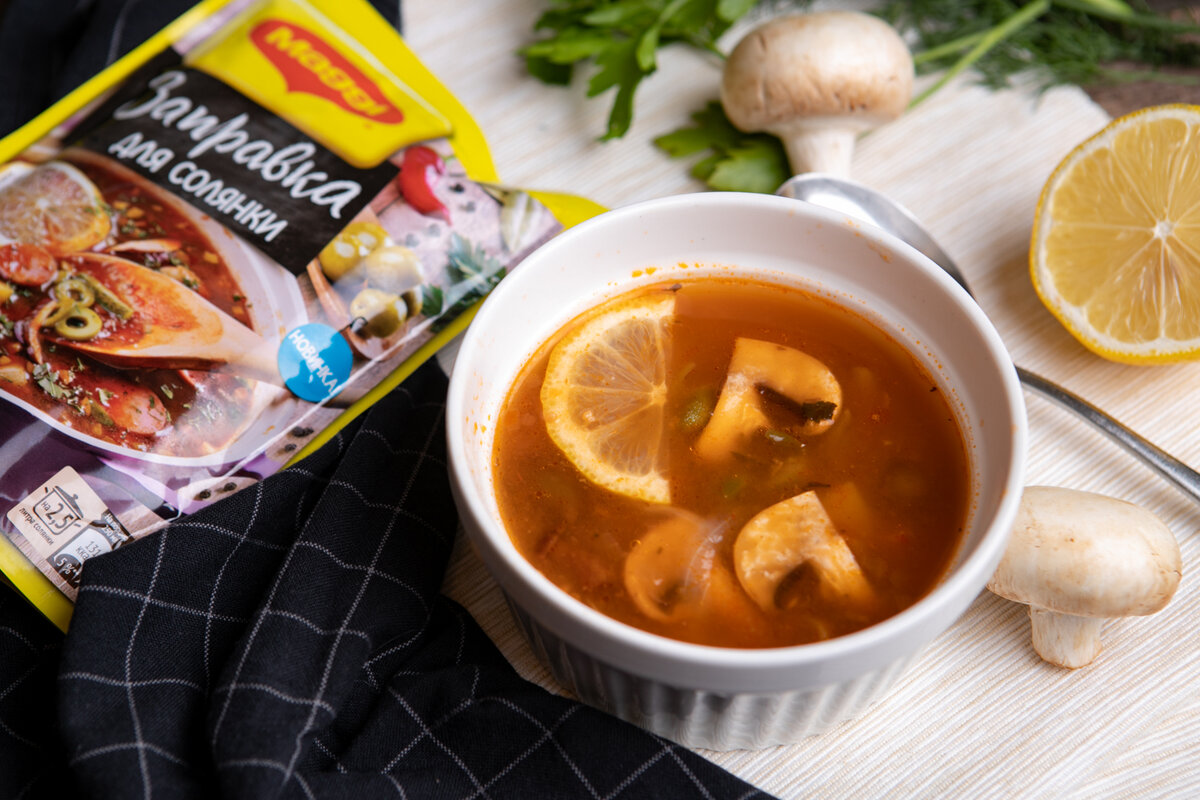 Опята и лисички можно использовать как свежие, так и замороженные. А если шампиньоны вы приобрели очень крупные, то порежьте их тонкими пластинами. Ингредиенты MAGGI® Заправка для солянки – 180 гр Шампиньоны – 400 гр Опята – 100 гр Лисички – 100 гр Лук репчатый – 100 гр Картофель – 400 гр Растительное масло – 15 гр Укроп свежий – 10 гр Петрушка свежая – 10 гр Как приготовить Подготовить и очистить овощи. Нарезать лук полукольцами. Картофель нарезать небольшими брусочками. Опята разморозить, слить жидкость. Лисички разрезать пополам, шампиньоны – на четыре части. Зелень измельчить. Обжарить в мультиварке лук с небольшим количеством растительного масла, постоянно помешивая, в течение 5 минут. Добавить грибы и готовить еще 5 минут. Заложить и отварить до полуготовности в кипящей воде картофель. Добавить лук и грибы, варить в режиме СУП до готовности, периодически помешивая. За пять минут до готовности добавить MAGGI® Заправка для солянки и нарезанную зелень. Довести до полной готовности