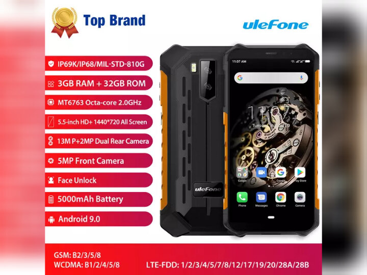 Отличный недорогой, качественный, а самое главное бронированный смартфон по супер цене в чёрную пятницу! Успейте сделать приятный сюрприз к новогодним праздникам! Ulefone Armor X5 MT6763 Восьмиядерный ip68 прочный водонепроницаемый смартфон Android 9,0 мобильный телефон 3 ГБ 32 ГБ NFC 4G LTE мобильный телефон! Глобальная версия. Цена всего 5,900 рублей со скидкой! Ulefone Броня X5 ПараметрыПродукт Размеры:158x77,5x13,85 ммПродукт Вес235g (телефон)/485g (телефон + аксессуары)ОбщиеМатериалПК + 10% GFЦветЧерный/оранжевый/красныйМощность адаптер5 V 2AСистемыOSAndroid 9,0ПроцессорMT6763Процессор ядроВосьмиядерный 64-разрядный 2,0 ГГцГрафический процессорMali-G71 MP2 770 МГц. Оперативная память3 Гб оперативной памятиВстроенная память:32 ГбСлот для карт памятиДаМакс. Расширения поддерживается256 ГБДисплейРазмер экрана5,5 дюйма HD +Экран Разрешение720*1440Мульти-сенсорный экран5КамераЗадняя Камера пикселей13 МП + 2 Мп AF F/1,8Фронтальная камера пикселей5MP FF F/2,0Видео Запись Разрешение1080
