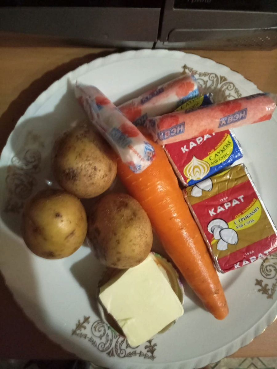 Способ приготовления: Морковь натираем на тёрке и тушим в сковороде. В это время почищенный картофель режем и кладём в кипящую воду. После того как протушили морковь кладём её тоже в кастрюлю. Следующим шагом натираем сыр и кладём его в кипящую воду. Пока всё вариться режем на три части крабовые палочки "Квэн" далее бросаем в последний момент. Приятного аппетита!