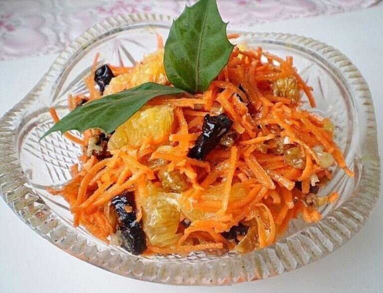 Я очень люблю готовить о очень люблю узнавать что-то новое. И вот как-то раз мне попался на глаза этот прекрасный салатик. Все ингредиенты были дома, поэтому решила, что сразу же буду делать. Муж увидев рецепт этого салата сначала с сомнением покачал головой и решил просто наблюдать за приготовлением со стороны. Но когда салатик был готов, он не удержался и решил попробовать. В итоге, еле за уши оттянула от него! Очень понравился! Для этого салатика нам нужно: Заправка: Начнем приготовление нашего салата. Берем глубокий салатник. Апельсин тщательно моем, снимаем с него кожуру, очищаем пленочки с каждой дольки. Этого можно и не делать, но без них салат будет более сочный. Теперь нарезаем на небольшие кусочки. Перекладываем в салатник. Чернослив без косточек хорошо промываем и заливаем горячей водой на 15 минут. Это необходимо для того, чтобы он стал более мягким. После этого чернослив нарезаем небольшими кусочками. Выкладываем в салатник. Изюм мы так же хорошо промываем, и заливаем го