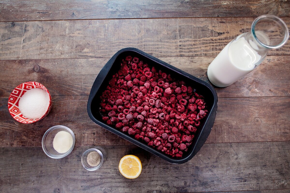 - Заранее размороженную малину залить 400 мл воды и аккуратно перемешать, чтобы не помять ягоды.