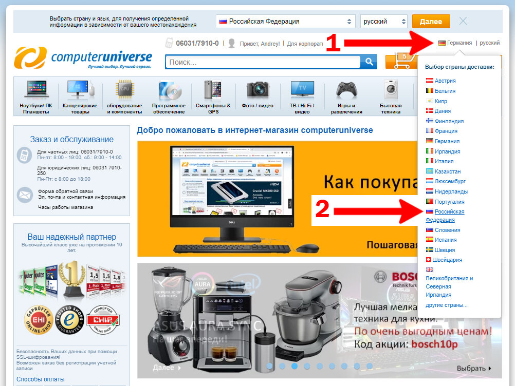 1. Чтобы цены отображались верно, в-первую очередь, на сайте computeruniverse.net переключите страну на Германию.