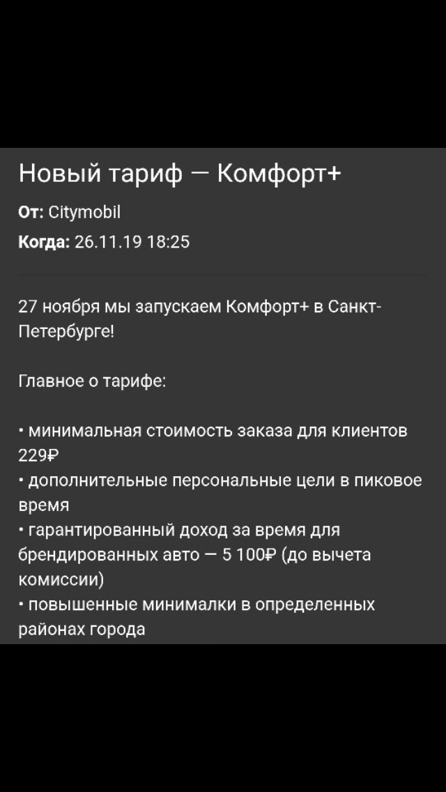 Всем привет. 26 ноября 2019 года СИТИМОБИЛ запустил новый тариф Комфорт+. Это конечно кошмар! Все мы знаем,что тарифы у Ситимобил самые нищебродские. Я уже писал в прошлой статье про Ситимобил.Может быть в Москве он имеет какую-то репутацию,то в Санкт-Петербурге все нормальные таксисты ее обходят стороной. В Питере очень мало заказов по этому тарифу выполняется.Даже в Яндексе и в других такси. Давай-те все таки рассмотрим плюшки этого тарифа. По машинам как у Яндекса:Оптима,камри,соната. Дальше вы можете все увидит на картинках. Кто работает в Ситимобил?Напишите ваши отзывы в комментарии. В группе Вконтаке же люди начали это обсуждать.Там они также придерживаются моего мнения об этом агретагоре. Ну,что же остается ждать когда Ситимобил откроет тариф "Бизнес"))) Я думаю,что это произойдет не очень скоро. Это не произойдет) Думаю даже через некоторое время прокатиться на этом тарифе в Ситимобил и пообщаться с водителем.Так скажем узнать всю правду работы в СИТИМОБИЛ изнутри. Оставляйте